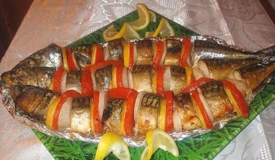 Обычно рыба невзрачно смотрится на столе, но благодаря такой подаче она уж точно не останется незамеченной. А благодаря овощам, которые будут запекаться вместе с ней, сочность останется и мясо станет нежнее. Скумбрия( небольшая) 3 шт. Приправы, можно взять одну для рыбы, или составить самим букет приправ, чтоб был приятный аромат. Репчатый лук 1-2 шт. ( предварительно замариновать) Свежие помидоры 3 шт. Болгарский перец 2 -3 шт. Лимон 1 шт. Зелень для украшения Сметана или майонезный соус Разделывание рыбы будет первым этапом приготовления, это нужно сделать очень тщательно, причём если готовите на праздник, то можете оставить голову, её, кончено, никто не ест, но пи подаче выглядит красиво. Тушку разрезаем на небольшие порционные стейки, которые маринуем в приправах и соусе. Овощи нарезать кольцами. Затем подготовить противень к запеканию рыбы и фольгу. Собираем чередую каждый кусочек кольцом лука, помидора и перца. Накрываем фольгой и запекаем при 170 градусах 20 минут. Затем снимаем