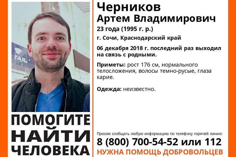 Мужчину с начала декабря разыскивают родственники. В Сочи пропал без вести 25-летний молодой человек, последний раз выходивший на связь с родными 6 декабря 2018 года. Артем Владимирович Черников 1993 года рождения, его рост 176 см, телосложение нормальное, волосы темно-русые, глаза карие. Во что был одет молодой человек на момент исчезновения, неизвестно. Всех, кто обладает информацией о месте нахождения Артема Черникова или обладает любой другой информацией о нем, просят обратиться по телефонам 8-800-700-5452 или 112.