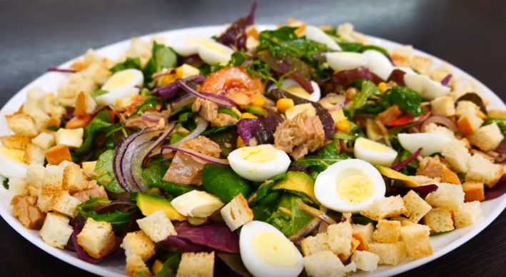 Для приготовления понадобится: микс салатов, листья салата, любая зелень и можно добавить пекинской капусты - 500 гр. красный репчатый лук - 1 крупная головка консервированная кукуруза - 40 гр. консервированный тунец в собственном соку - 1 баночка сыр моцарелла или фета - 150 р. спелый авокадо - половинка свежий помидор - 1 шт. или 5-6 помидорок черри перепелиные яйца - 5 шт. сухарики Для соуса понадобится: сырой желток - 3 шт. горчица - 1 ч. ложка мед - 1 ч.ложка соевый соус по вкусу - 2 ст. ложки оливковое масло - 50 мл. Способ приготовления: 1. Нарезаем репчатый лук полукольцами 2. Моем зелень, обсушиваем ее и выкладываем на плоскую тарелку. Добавляем нарезанный лук 3. Добавляем кукурузу 4. Открываем баночку тунца и сливаем рассол. Выкладываем кусочки рыбы на зелень 5. Нарезаем сыр небольшими кубиками 6. И выкладываем его на салат 7. Следом нарезаем авокадо 8. Режем помидор и все выкладываем на салат 9. Далее делаем соус для салата. В чашку кладем желтки, горчицу, соевый соус, м