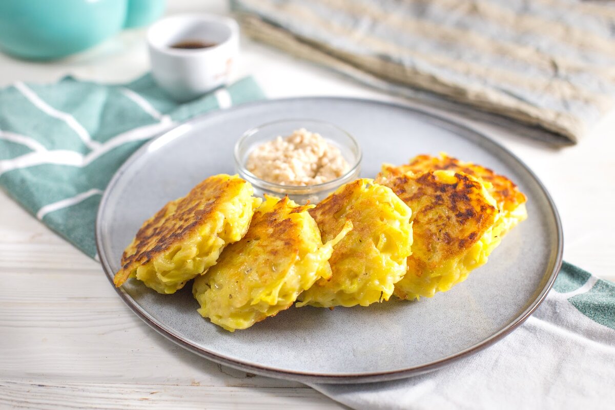 - Натрите картофель, кабачок и половину лука на крупной терке. Добавляйте ингредиенты по вкусу. Переложите в глубокую миску. Отожмите немного руками от лишней влаги. Посолите. Добавьте яйцо, муку. Тщательно перемешайте. Разогрейте сковороду с 1 ст.л. растительного масла. Разогрейте духовку до 200 гр.