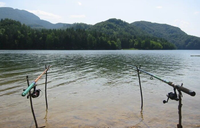 Почему в разговорах рыбаков о рыбной ловле постоянно звучат выражения «утренняя зорька», «вечерняя зорька». Ответ на этот вопрос прост. Обитатели речных глубин, большей частью, питаются на зорях. Вот поэтому большая часть наших соплеменников стремятся на рыбалку к вечеру. И ,коротая ночь у костра, ждут звона колокольчиков на своих донках к восходу солнца. Есть такой вид рыбной ловли, называется «на перевес» . Поплавок здесь не нужен совсем. В чем суть? В первую очередь, выбери место ловли . Прикорми, продумай и установи свой рыбацкий стульчик так , чтобы он удобно для вас стоял перед конструкцией, которая показана на эскизном рисунке. Если вы сидите на стуле, то комли удилищ должны быть от вас на расстоянии вытянутой руки. Баланс у удилищ должен быть отрегулирован так, чтобы при малейшей нагрузке на хлыстик удилища комель поднимался к верху. Когда рыба потянет насадку, хлыстик пойдет к воде и поднимет комель - это сигнал рыбаку на подсечку. Конструкцию можно так отрегулировать, ч
