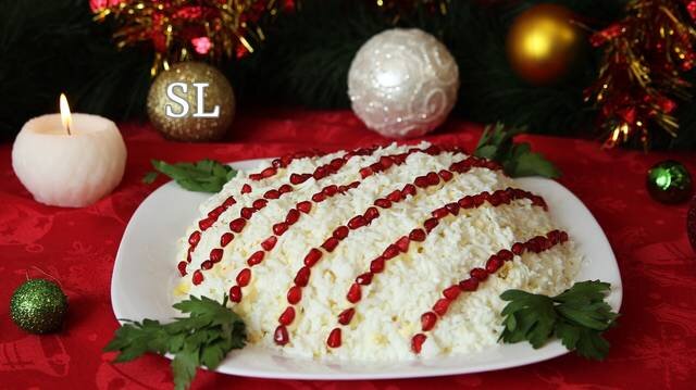 Теперь самое приятное – это украшение. Чтобы гранатовые зерна не скатывались с неравномерной поверхности салата, я делаю майонезные линии, на которых и будут держаться гранатовые зерна.