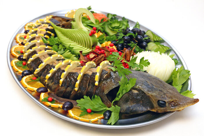 Осетр получается действительно царский - вкус просто изумительный и неповторимый! Всем любителям рыбы обязательно советую приготовить такого осетра – это не только вкусно, но еще и красиво смотрится на любом праздничном столе! Родные и друзья обязательно оценят ваши старания! Какие продукты понадобятся для приготовления? Берем осетра средних размеров, такого, чтобы умещался на лист в вашей духовке. Также понадобится граммов 800 оливкового либо растительного масла, сорок-пятьдесят граммов сливочного масла. Немного бальзамического уксуса, приблизительно граммов сорок, а также тридцать граммов лимонного сока. Немного мускатного ореха, а также соль и другие специи по вашему вкусу. Приготовление осетра по-царски в духовке Обязательно следует тщательным образом вымыть осетра и также тщательно его почистить. Необходимо удалить жабры, убрать внутренности. Затем снова хорошенько промываем нашего осетра водой. Затем следует взять большую кастрюлю, куда точно влезет осетр. Эту кастрюлю напо