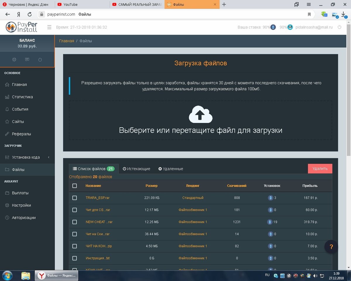 Оплачиваемый файлообменник, выплата на кикви в течении 3 дней. Сам выводил и не раз! До сих пор зарабатываю. ===================================================== Ссылка для регистрации! https://payperinst.com/?ref=2237 ===================================================== Для тех то полностью не разобрался как пользоваться скачивайте более подробную и разобранную инструкцию. СТАВЬТЕ ЛАЙКИ И ПОДПИСЫВАЙТЕСЬ НА КАНАЛ!! Инструкция: можно скачать по ссылке. http://rpfile.ru/d/CDgQ6_cPlz Суть самого заработка заключается в скачивании ваших файлов по ссылке которую вы должны рекламировать. Подробнее: 1) Что нам нужно, нам нужно иметь канал на ютубе, думаю он есть практически у каждого. Если нету, регистрируемся на ютубе , создаем канал. И так, у нас есть канал на ютубе. Желательно чтобы название канала было что то вроде : "ЧИТЫ К ИГРАМ" "CHEAT CS:GO" 2) Далее нам нужна зарегистрироваться на сайте файлообменника Payperinst ссылка на сайт: https://payperinst.com/?ref=2237 . Заре