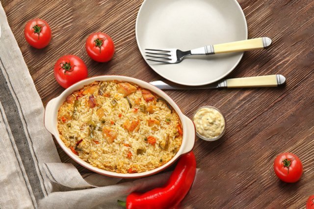 Рис, запеченный под сыром пармезан с овощами и куриным филе
