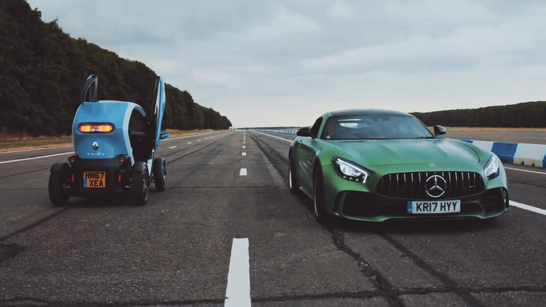 Журнал Top Gear славится своими необычными тестами и под занавес 2018 года британцы устроили ещё одну яркую гонку. В заезде на 402 метра по прямой журналисты свели два автомобиля: могучий Mercedes-AMG GT R и... электрический Renault Twizy. Да, два столь непохожих транспортных средства сошлись в одном заезде. Правда, условия были неравные не только из-за разницы в мощности. 17-сильный французский электромобиль ехал как и положено, а вот немецкое купе с 585-сильным 4-литровым турбированным V8 запустили задним ходом. Чем закончилась неординарная гонка — не расскажем. Лучше посмотрите видео и всё узнаете сами: