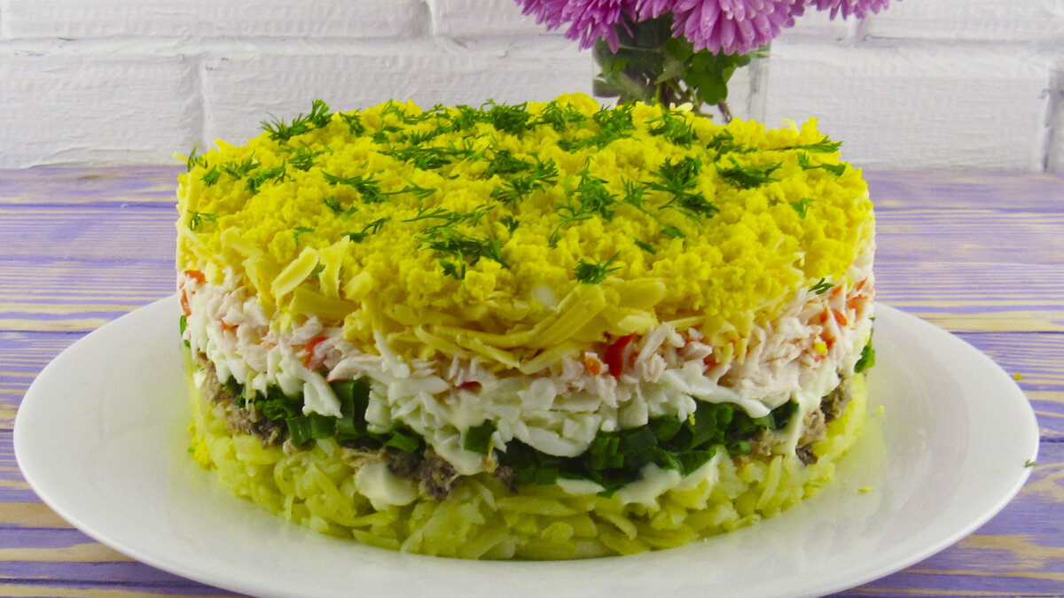 7 слой - яичные желтки, размятые вилкой в крошку. Сверху салат украшаем зеленью. Чтобы салат был вкуснее, ему нужно несколько часов, чтобы пропитаться. Приятного аппетита вам, дорогие друзья! Ставьте лайк и делитесь рецептом в своих соц