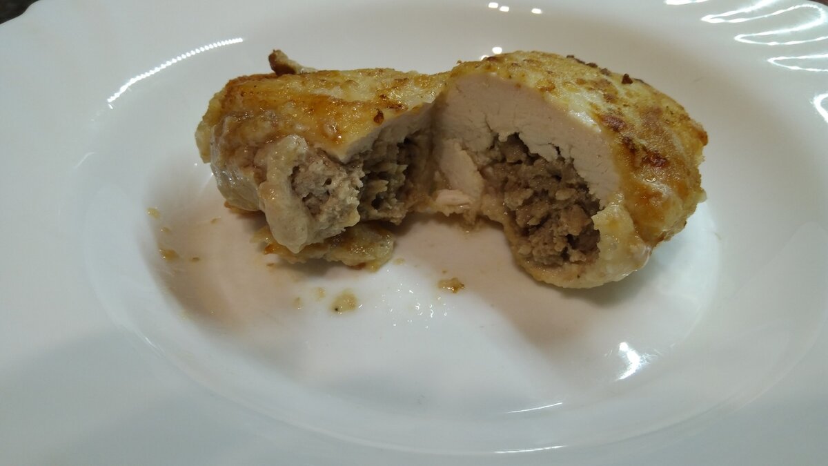 Понадобится: филе грудки 1 курицы, фарш свинина-говядина 300 г. 1 яйцо, 1 стак. муки, соль, перец чёрный молотый, маринад Сама срезаю с грудки курицы филе Филе укладываю в пакет и отбиваю В филе добавляю маринад: взбиваю яйца 2 шт. до белой пены миксером, добавляю очищенное растительное масло, снова взбиваю до белой массы, затем добавляю 1 ч.л. горчицы, выжимаю 1 ч.л. сока лимона, солю, перчу, выдавливаю 2 зубчика чеснока, снова взбиваю. Филе мариную 20 минут В фарш добавляю 1 яйцо, соль, перец по вкусу и выкладываю на отбитое филе курицы в тарелке с мукой Фарш заворачиваю в филе курицы и обваливаю в муке Обжариваю на сковороде в растительном масле без запаха Получаются очень вкусные рулетики, можно на новогодний стол, украсив зеленью и оливками.