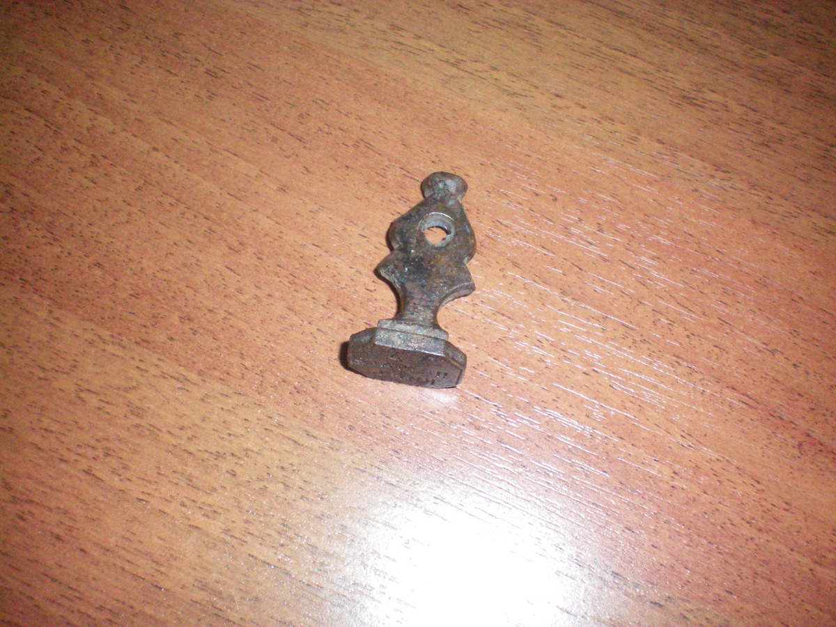 От прабабки осталась большая жестяная коробка с пуговицами, старинными заколками и прочей мелочью. Да и сейчас по привычке, прежде чем выбросить рубашку или куртку, жена отрезает пуговицы, застежки и складывает в эту своеобразную копилку в надежде, что когда ни будь пригодится. Когда приходят внуки , то они любят копаться в этой коробочке, придумывая разные игры, типа , кто больше насобирает красных пуговиц или , кто найдет самую большую пуговицу. Как то внук, роясь в этих в первичных сокровищах, нашел необычную металлическую штучку, о которой я совершенно забыл. Это была небольшая латунная печать с восьмиугольным основанием, с глубоко вырезанными зеркальными буквами в рамке, в оттиске на пластилине читалась фамилия с инициалами владельца, то, что она старинная, определил по твердому знаку в конце фамилии. Как обычно, пришлось отвечать на вопросы, для чего она, зачем с дыркой в ручке и как ей пользоваться, мне и самому стало интересно разобраться с этими вопросами. Дырка в ручке, эт