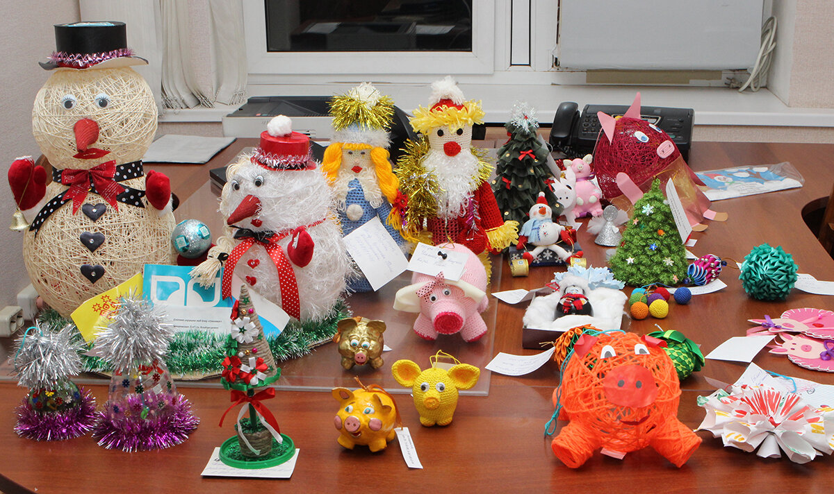 Работы выполнены с использованием определенных техник из самых различных материалов. Количество фигурок с символом года лидируют среди всех творений. Поросята разных размеров из цветной бумаги, плотных ниток и веревок, связанные, сшитые, вырезанные… Кроме них новогоднюю выставку украшают снеговики-великаны, Дед Мороз и Снегурочка, множество елочек, фонарики, шарики и многое другое. Среди такого разнообразия поделок, а их поступило более 40 штук, выбрать лучшую работу оказалось непросто. В категории «Работники предприятия» в номинации «Елочная игрушка» первое место было присуждено специалисту по кадровому делопроизводству Анжелике Бочкаревой, второе – инженеру-технологу Инне Соловьевой и третье – лаборанту химического анализа отдела технического контроля Ольге Игнатьевой. В номинации «Игрушка под елку» первое место заняла аппаратчик сжигания цеха производства мягчителя Наталья Трифонова, второе – машинист по стирке и ремонту спецодежды Раиса Ортикова и третье – лаборант цеха производств
