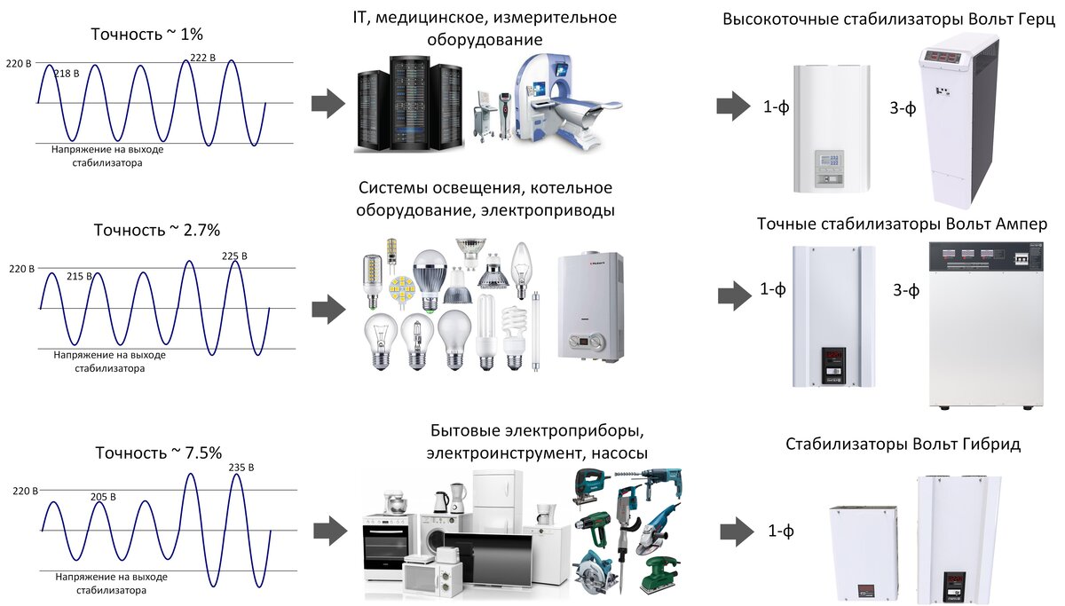 Процесс подбора стабилизатора напряжения отличается от другой бытовой техники прежде всего широким набором характеристик, на которые нужно обратить внимание во избежание неправильной его работы. Одной из таких характеристик является точность стабилизации. Точность стабилизации - это погрешность, с которой работает стабилизатор напряжения. Другими словами, это величина, показывающая на сколько Вольт будет отличаться напряжение на выходе стабилизатора от эталонных 220В. Обычно данный параметр указывается в процентах и согласно ГОСТ 13109 отклонение не может быть больше 220В±10% для нормального функционирования бытовой техники. Точность стабилизации зависит напрямую от количества ступеней стабилизации и от ширины диапазона стабилизации. При одинаковом количестве ступеней, но разной ширине диапазонов, в которых работают стабилизаторы, погрешность стабилизации будет тоже различной. На сегодняшний день, практически все стабилизаторы напряжения имеют точность не хуже той, которая требуется п