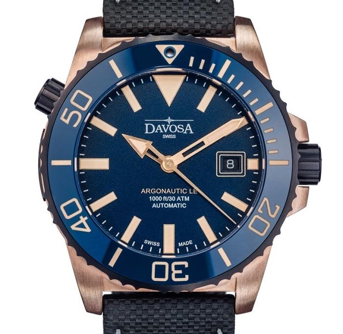 Швейцарский бренд Davosa расширил свою коллекцию Argonautic новыми версиями часов. Компания представила две лимитированные модели дайверских часов Davosa Argonautic Bronze. Как видно из названия, главной особенностью часов будет корпус из бронзы — этот металл не одно столетие выбирали мореходы, а позже и водолазы, для своих инструментов. Модель будет предлагаться в двух версиях с синими или черными деталями (циферблат и безель). Корпус При создании корпуса использовалась бронза, нержавеющая сталь с черным PVD покрытием и керамика. Диаметр — 42 мм, толщина — 13,5 мм. Основная часть корпуса, которая изготовлена из бронзы, с матовой отделкой (сатинирование крупной щеткой). Вращающийся в одну сторону безель с черным PVD покрытием имеет керамическое кольцо с дайверской шкалой с крупными арабскими цифрами. Метки и цифры на этой шкале имеют люминесцентное покрытие. В зависимости от версии это кольцо может быть черного или синего цвета. Причем черное кольцо сатинированное, а синее полированное