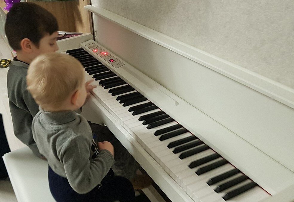 Во время беременности мы с мужем прочитали много интересных статей о том, что классическая музыка положительно влияет на развитие умственных способностей. Но даже не каждая, а в особенности фортепианные произведения Моцарта. Влияет она на всех людей, но, чем ты моложе, тем больший эффект можно наблюдать, а если ты ещё вообще только формируешься у мамы в животике, то вообще вундеркиндом родишься. Поэтому примерно с 20-й недели беременности (когда ребёнок уже слышит) я начала включать дома для фона произведения Моцарта. И, когда Саша родился "классика" продолжала частенько звучать у нас в доме. Пока неизвестно, отразилось ли это как-то на умственных способностях Саши, но зато любовь к музыке и интерес к музыкальным инструментам у него есть. Он с самого детства пытается самостоятельно играть на синтезаторе и гитаре (настоящих), иногда пытается подыгрывать мелодиям, а зачастую просто кайфует, от души нажимая на клавиши. Я всегда мечтала играть на фортепиано, муж тоже хотел научиться, поэто