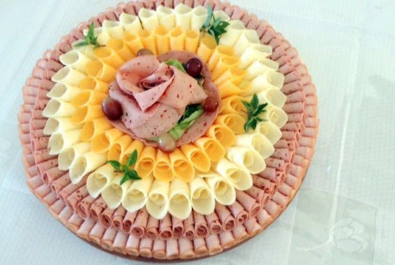В очередной раз собрал для вас крутые идеи для подачи такого вида нарезок, помимо этого расскажу как оригинально порезать яйца и как ими можно украсить любое блюдо. А для верхнего фото вам понадобится: 2 вида сыра и 2 вида мяса, сворачивается всё в трубочки и в конце делаем цветок, как я рассказывал ранее. Веер! Не переживайте, такой тарелки нет даже у меня, но место неё используется обычная фольга, которая как мы знаем может принять любую форму. Используйте больше красок, можете добавить зелени и ваш веер станет в 1000 раз краше и интереснее. Посмотрите хотя бы на эту композицию, больше красок добавляет ей петрушка, зеленый салат и огурец. Так же как и здесь, но сложность в том, чтобы придать композиции нужный вид придётся воспользоваться хитрыми уловками. Например чтоб крася не падали, используйте творожный сыр в середине, колбаска к нему прилипнет и будет держаться, даже если это будет третий слой "цветов". Ну и наконец про яйцо. На кончик зубочистки привяжите нитку. Воткните в сер