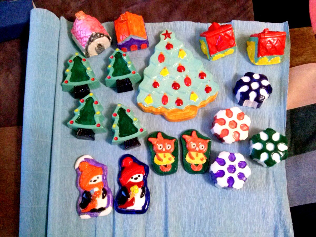 Подарки к этому новому году я делала своими ручками. А все началось с того, что мне попались наборы с формочками для изготовления фигурок из алебастра... и всё, пошло-поехало. Дальше я как маньячка искала формочки, которые мне понравятся, потому что они же еще не все кажутся симпатичными! Таскала килограммами домой гипс, экспериментировала с концентрацией, составом краски и лаками. С одной стороны, это, наверное, не слишком рационально - делать такие вещи руками, когда в магазине такие готовые хрени можно купить недорого и в больших количествах. С другой стороны, это кайф - видеть, как из того, что было просто кучкой строительного материала и набором красок, появляется нечто симпатичное. Все из того, что я сделала, мне симпатично. Но больше всего я влюбилась в эти маленькие елочки, которые похожи на имбирные прянички. Ну а делать фигурки мне так понравилось, что я хочу запилить на эту тему обучалку. Но чтобы понять, нужно ли это вообще кому-то или нет, я сделала - трам-тарам-т