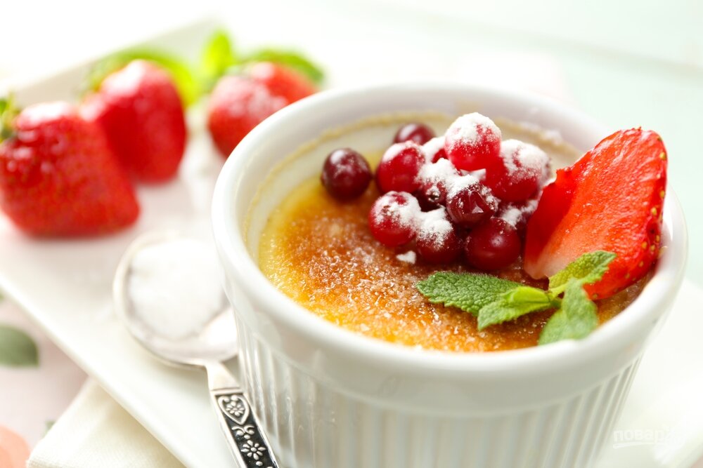 Нежный и сливочный вкус всеми любимого крем-брюле сражает наповал. Вы запросто приготовите этот десерт дома, а мы расскажем, как. Главное – соблюсти все пропорции, и не торопиться при приготовлении. Десерт представляет собой сливочную массу с карамелизированной хрустящей корочкой, блюдо в основном состоит из сливок, яичных желтков и сахара. Для приготовления классического крем-брюле (на 8 порций) вам потребуется: Совет: яйца и сливки используйте комнатной температуры. Заранее выберите их из холодильника. Включите духовку нагреваться на 150 градусов. Приготовьте 8 глиняных формочек для крем-брюле и одну большую форму для выпечки, в которую мы поставим формы с десертом. Отделите желтки от белков, белки нам не понадобятся. В большой миске взбейте желтки с 1/2 стакана сахара до растворения последнего. Масса должна стать бледно-желтой. Если используете экстракт ванили, то добавьте его к желткам вместе со сливками и взбивайте на малых оборотах до однородности. Если у Вас ваниль в стручках, т