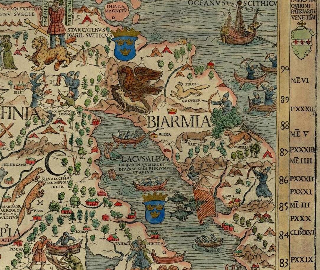 Обратимся к русским летописям. Только в одной из них мы найдем упоминание о легендарной стране Биармии. «Отец русской истории» В. Н. Татищев ссылается на летопись Иоакима, епископа Новгородского, которую иногда называют Иоакимовской. В ней говорится: «Сие есть достопамятное изъяснение, что Бярмия или Корелия тогда об реку Кимень с Финляндией или Варягами граничила». Эта запись дала ему основание предположить, что Биармия находилась где-то в районе Карельского перешейка. Более подробные сведения по этому вопросу можно отыскать в древлехранилищах Дании. Архивы старинных монастырей Исландии сохранили ценнейшие материалы по истории Русского Севера. Это – исландские саги, которые представляют собой эпические произведения с элементами фантастики. В одной из них говорится о том, что Биармия располагается в районе Кольского полуострова, одна из границ этой страны проходит в устье Северной Двины. Впервые на карте Биармию изобразил шведский ученый Олаф Магнус, поместивший ее на Кольском полуостр