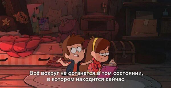 Из данной картинки можно сделать вывод, что Диппер придерживается древнего фразеологизма. В отличие от него, Мэйбл - девочка, живущая «здесь и сейчас». Диппер хочет казаться старше, игнорируя тот факт, что он ещё ребёнок, а его сестра, наоборот, боится подходящего завершения детства. Стать взрослой для неё - это лишение розовых очков. Конец света, можно и так выразиться. Надо понимать, что эти разные по характеру дети вместе образуют своеобразный баланс, Инь и Ян. Мэйбл помогает Дипперу осознать ценность детства, а он, в свою очередь, придаёт ей смелость перед взрослением. Если Вам понравилась статья, Вы любите мультики, то подписывайтесь на канал. И не забывайте про лайки :)
