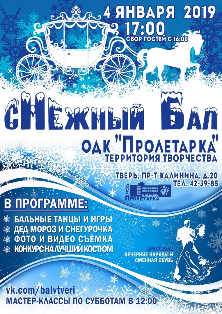 4 января в 17.00 Тверской областной Дворец культуры «Пролетарка» вновь проводит «Снежный бал», который открывает череду рождественских праздников. Возраст участников – от 17 лет и до бесконечности. Пожелание организаторов - одежда светлых снежных тонов от белого до серебристого. Непременное условие – хорошее настроение! Знатоки утверждают, что Программа «Московское долголетие», помимо занятий йогой, скандинавской ходьбой и другими видами спортивных нагрузок для старшего поколения, делает особый акцент на танцах! И это отнюдь не случайно…Танец укрепляет здоровье сердца, тренирует мышцы, помогает сформировать красивую осанку и отличную координацию движений, развивает дыхательную систему, убирает лишний вес, снижает влияние стресса на организм. В конце концов, танцы - невероятно мощный источник энергии! Всем этим и предлагают заняться сразу после новогодних праздников организаторы второго «Снежного бала» - танцевально - спортивный клуб «Овация» Тверского областного Дворца