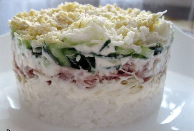 Новый слоеный салат на праздничный стол! Очень нежный, вкусный - отличная альтернатива приевшемуся салату "Мимоза". Берите на заметку, салат простой, но очень вкусный! Рецепт вам точно пригодится Приготовление: Сначала варим 4 куриных яйца, а также 50 гр риса. Тем временем шинкуем 1 луковицу и заливаем маринадом. Для маринада смешиваем 100мл воды, 50 мл уксуса 9%, 1 чайная ложка сахара, 1 чайная ложка соли. Маринуем минут 15-20. Когда все ингредиенты для приготовления салата будут готовы, начинаем выкладывать слои. Дно салатника смазываем майонезом, и также каждый слой смазываем. Ингредиенты выкладываем в такой последовательности: 1 слой - рис