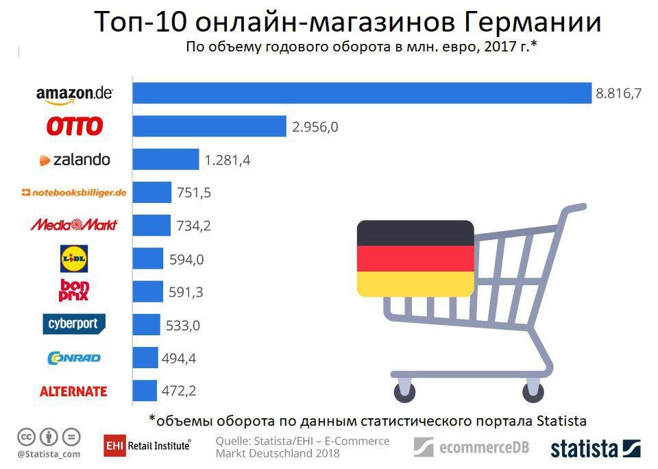 Для начала можно посоветовать поисковый агрегатор idealo.de, который работает по принципу того же яндекс-маркета. Преимущества – 1) наличие графика цен (так можно отследить, есть ли вообще скидки и примерно когда) и 2) «будильника цены» - на почту придет уведомление, когда цена опустится до заданного значения. Пользователям с ненемецкими ip нужно будет пройти верификацию (капчу). Среди списка магазинов есть и крупные и проверенные, и «ноунеймы» с неизвестного качества продукцией. Для наглядности и ориентировки топ-10 немецких онлайн-магазинов по выручке (см. картинку). Пять из них специализируется на электронике прежде всего ПК, смартфоны и их комплектующие - notebooksbilliger.de, cyberport, Conrad, Alternate. Media Markt ещё в 2015 году не был в рейтинге, с 2016 уверенно держит 5-ую строчку. А Apple, наоборот, уже третий год не входит в первую 10-ку. Сайт notebooksbilliger имеет русскую версию, поэтому довольно известен и удобен для пользователя. При покупке смартфонов важно обращат