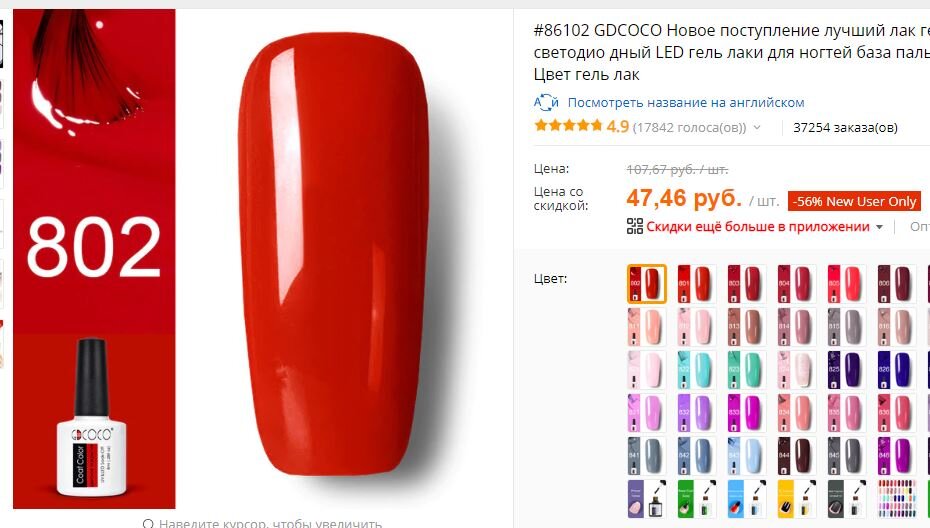 Сто лет уже не баловала себя заказами с Алиэкспресс. То нет времени, то денег, то еще какое-нибудь шило в попе... Но сейчас я на каникулах и вообще хочу себя побаловать шоппингом, хотя бы таким. На самом деле мой последний шоппинг заключался в покупке какой-то техники в Эльдорадо, остальное это покупки у дома - бытовые, продуктовые и игрушки в FixPrice. На Aliexpress же последний раз я была, когда покупала себе робот пылесос - доставили за 3 дня - я рада до опупения, но к сожалению все дела он за меня не делает. Сейчас хочу повыбирать себе и малышне, что-нибудь по старой памяти на Алишке, ждать ностальгически свои 1-2 месяца и с любопытством вскрывать полученные посылки. Лак уже выбрала. Но надо будет еще приобрести к нему лампу. Базу и топ брать не буду - мне нравится гель-лаки, но, когда весь комплект наносится на ногти - вид просто ужасный - такие они становятся толстыми - к этому я никогда не привыкну. Пока попробую только этот цвет, хотя текущая скидка так и манит забацать 2-3 фла
