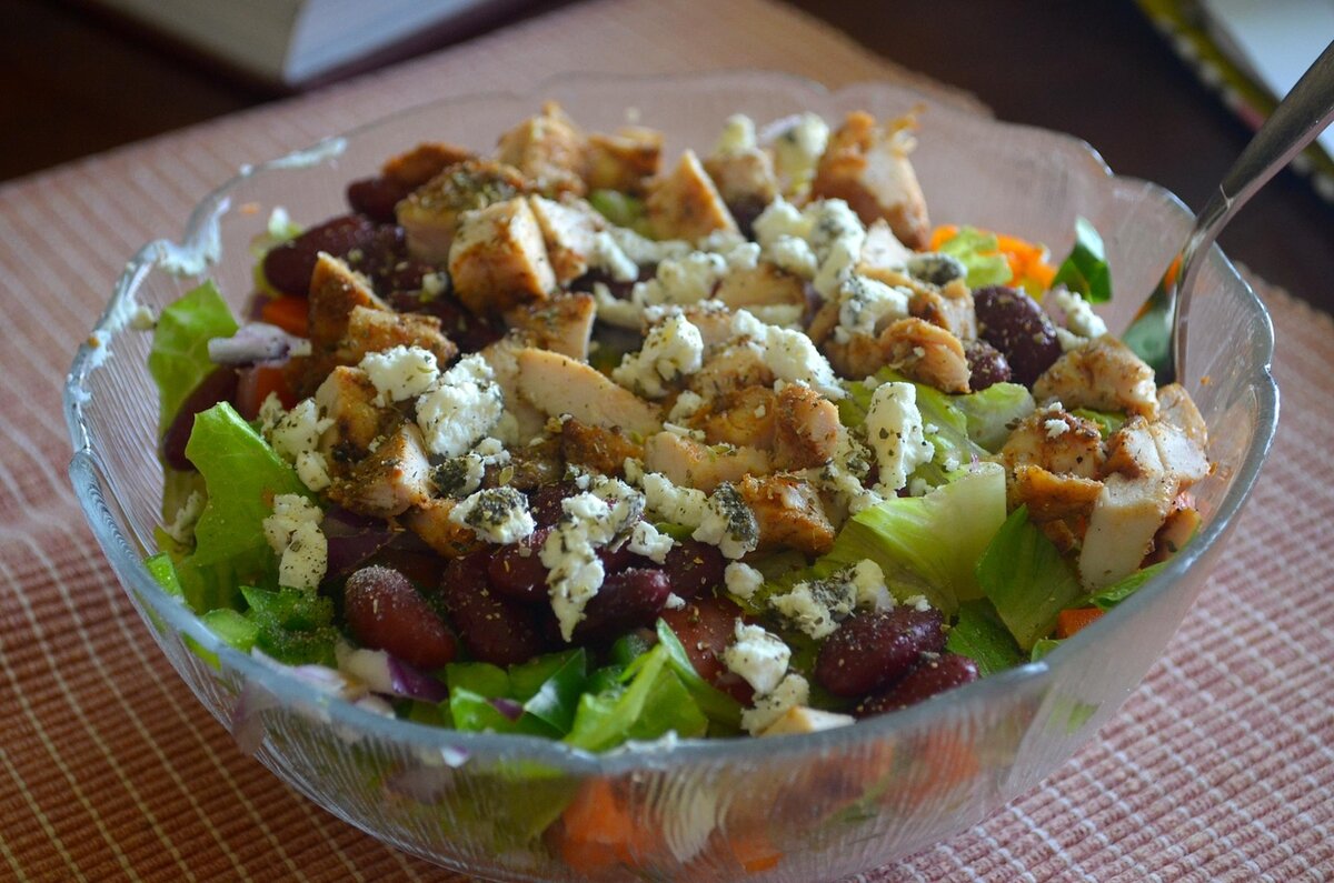Окорочок нарезать кубиками или соломкой, сложить в салатник. Яйца очистить и нарезать кубиками. Салатные листья промыть, обсушить и тонко нарезать. Слить жидкость с фасоли, промыть под холодной водой и сложить в салатник. Натереть сыр, выдавить чеснок. Добавить в салат сыр и чеснок. Посолить и приправить перцем по вкусу, добавить сухарики. Заправить майонезом, хорошо перемешать.