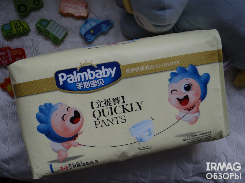Ещё можно найти заверения самого бренда, что он хоть и китайский, но технологии у него огого, и он ни капельки не уступит по качеству японцам. И, кстати, забегая вперед, прав. Это не первый китайский бренд, у которого я пробую подгузы, последний год мы пользовались Insinse, и вот они уж точно ничем не отличаются от японцев, разве что почему-то китайцы не делают липкой ленты для сматывания грязного изделия (у Палмбеби её тоже нет), но я настолько привыкла без неё, что она уже кажется ненужной. Давайте смотреть, как и что выглядит и не вату ли в бумаге мне подсунули. Упаковка у Палмбеби прям шикарная. Я не про большеглазых детей с хозяйственной перчаткой на голове, а про материал упаковки.