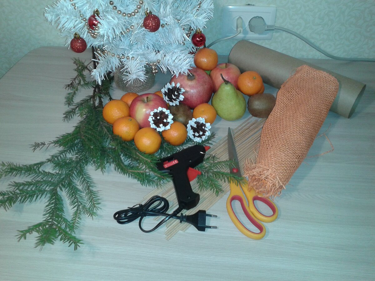 Сегодня я расскажу как сделать букет из фруктов. Для этого нам понадобятся: - фрукты (гранат, груши, яблоки, киви и мандарины) - краски акриловая белая - шишки сосновые (для украшения) - ветки ели - шпажки деревянные - упаковочная бумага - нитки - клеевой пистолет - скотч - декоративная лента - степлер - ножницы А еще нам пригодится скотч, веревка и клеевой пистолет. Сначала мы покрасим шишки белой краской. Затем с помощью клеевого пистолета крепим шишки к шпажкам. Все фрукты закрепляем на шпажках. Для этого в каждый фрукт втыкаем от одной до четырех шпажек. Когда все фрукты подготовлены, начинаем формировать букет. В середине мы разместим гранат- это будет центр композиции, по степенно добавляем фрукты к букету. Конструкция получается тяжелая, поэтому лучше укладывать все это на столе, вверх шпажками для последующего закрепления скотчем. Скреплять лучше постепенно, добавляя по одному, два фрукта, чтобы букет лучше держался. Далее добавляем наши шишки и еловые ветки. Следующий этап -