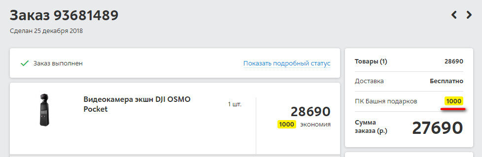 У М.Видео проходила акция "башня подарков" по которой раздавали купон на 1000 рублей на покупки от 5000. Так цена камеры стала 27690 руб.