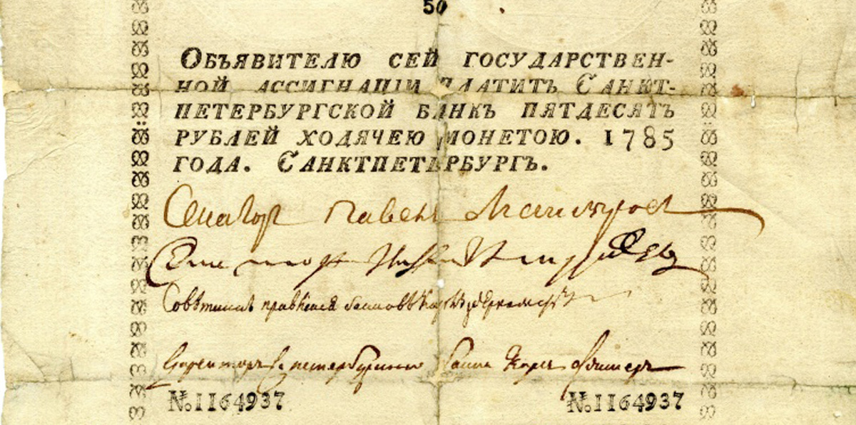 29 декабря 1768 года Екатерина II подписала манифест, который вводил в обращение бумажные денежные знаки. С этого момента началась история отечественных купюр. Активное экономическое развитие, рост торговли в середине XVIII века сопровождались и увеличением объема торговых сделок. Но из-за недостатка золота и серебра денежное обращение в России обеспечивалось, как правило, медными монетами. Это было неудобно. Например, платеж в сумме 100 рублей в пятикопеечных медных монетах (наиболее популярная монета в то время) весил более 6 пудов, а это составляло почти 100 килограммов. Соответственно, 1 рубль "медяками" весил почти килограмм. Расплатиться за мелкие покупки можно было и медной монетой, но при крупных торговых операциях купцы испытывали серьезные трудности. Первые российские бумажные деньги мало походили на современные банкноты. Это были ассигнации, больше похожие на долговые расписки. Банки в любой момент обязаны были менять ассигнации на монеты. Несмотря на неказистый внешний вид,