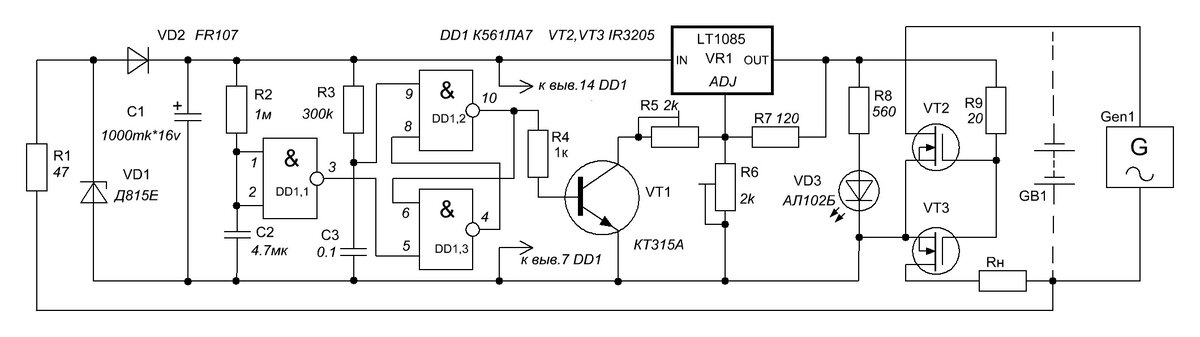 Из электротехники известно, что сопротивление нити накала электровакуумных приборов в холодном состоянии в 10 раз меньше, чем в нагретом. Таким образом, в маленьком объеме нити накала мгновенно выделяется большая тепловая мощность. Это приводит к термонапряжениям в стеклянном баллоне и нити накала. Для увеличения срока службы мощных и дорогостоящих радиоламп, прожекторов, проекционных и прочих ламп используют ступенчатое или плавное включение нити накала на полную мощность. Обычный метод уменьшения бросков тока - это установка мощных низкоомных сопротивлений. Мощные полевые транзисторы позволяют избавится от дорогих, дефицитных низкоомных резисторов. На рис.1 показана принципиальная электрическая устройства позволяющая в две ступени увеличить ток через нить накала. Основой устройства является электронный ключ на полевых транзисторах VT2,VT3 и RS триггер на логических элементах 2И-НЕ (DD1.2,DD1.3). В этом устройстве полевые транзисторы работают как стабилизаторы тока (низкоомные резисторы не требуются). Цепочка R3C3 служит для установки RS триггера в исходное состояние при первоначальном запуске. В момент включения устройства (а также при пропадании напряжения накала) на выводе 9 логического элемента DD1.2 появляется уровень нулевого напряжения. Для логического элемента «2И-НЕ» приоритетный сигнал - уровень нуля. Особенностью RS-триггера является то, что он срабатывает от первого нулевого импульса, а на остальные не реагирует. Интегрирующая цепь R2С2 создает временную задержку на включение, порядка 4 сек. В первоначальный момент заряд конденсатора С2 идет через резистор R2,VD2. Таким образом, через 4 сек. на выходе логического элемента DD1.1 появляется уровень нуля. Итак, в исходный момент на выводе 9 DD1.2 уровень нуля, а на выводе 5 DD1.3 уровень единицы. Такому состоянию входных сигналов RS-триггера соответствует то, что на выводе 10 будет уровень единицы, транзистор VT1 открыт. Этот транзистор подключает резистор R5 параллельно резистору R6, в результате чего выходное напряжение стабилизатора VR1 снижается до уровня установленного резисторами R5,R6. Электронный ключ открыт, и напряжение накала поступает на нагрузку через транзисторы VT2,VT3, но ток нагрузки будет ограничен. После заряда конденсатора С3 на выводе 9 DD1.2 присутствует уровень единицы. Единичные сигналы на обоих входах RS-триггера соответствуют режиму хранения информации триггера. Через 4 секунды на выводе 5 DD1.3 появляется уровень нуля, триггер переворачивается и подает низкий уровень на транзистор VT1. Транзистор закрывается, и резистор R5 отключается от резистора R6, выходное напряжение стабилизатора VR1 увеличивается, каналы транзисторов VT2,VT3 полностью открываются (напряжение накала без ограничения тока поступает на нагрузку). В случае кратковременного пропадания напряжения накала на конденсаторе С3 сформируется уровень нуля, триггер вернется в первоначальное состояние и подаст высокий уровень на транзистор VT1 а, следовательно, включит резистор R5 параллельно резистору R6. Выходное напряжение стабилизатора VR1 уменьшится, в результате чего произойдет ограничение тока нагрузки транзисторами VT2.VT3, так как уменьшится управляющее напряжение (между затвором и истоком). По истечению выдержки времени в 4 сек. триггер перевернется и транзисторы VT2,VT3 полностью откроются. Временную задержку можно и