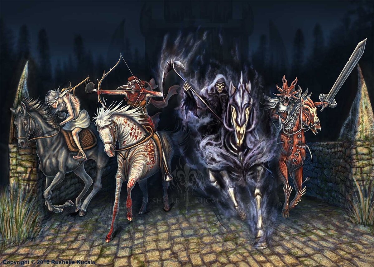 В шестой главе Откровений Иоанна Богослова,описывается появление четырёх всадников,которые являются предшественниками Апокалипсиса-второго пришествия Иисуса Христа и конца света..Следуют они в строгой очерёдности и их появлению предшествует Агнец,который снимает печати с Книги Жизни.После снятия каждой из первых четырёх печатей тетраморфы восклицают Иоанну — "иди и смотри" — и перед ним поочерёдно появляются апокалиптические всадники.В иудео-христианском вероучении и богословии тетраморф-крылатое существо из видения пророка Иезекииля с четырьмя лицами — человека, льва (с правой стороны), быка и орла (с левой стороны). Итак первым идёт всадник на белом коне.Имя его Завоеватель. "И я видел, что Агнец снял первую из семи печатей, и я услышал одно из четырёх животных, говорящее как бы громовым голосом: иди и смотри. Я взглянул, и вот, конь белый, и на нем всадник, имеющий лук, и дан был ему венец; и вышел он как победоносный, и чтобы победить." Миссия этого всадника-побеждать.Он появляе