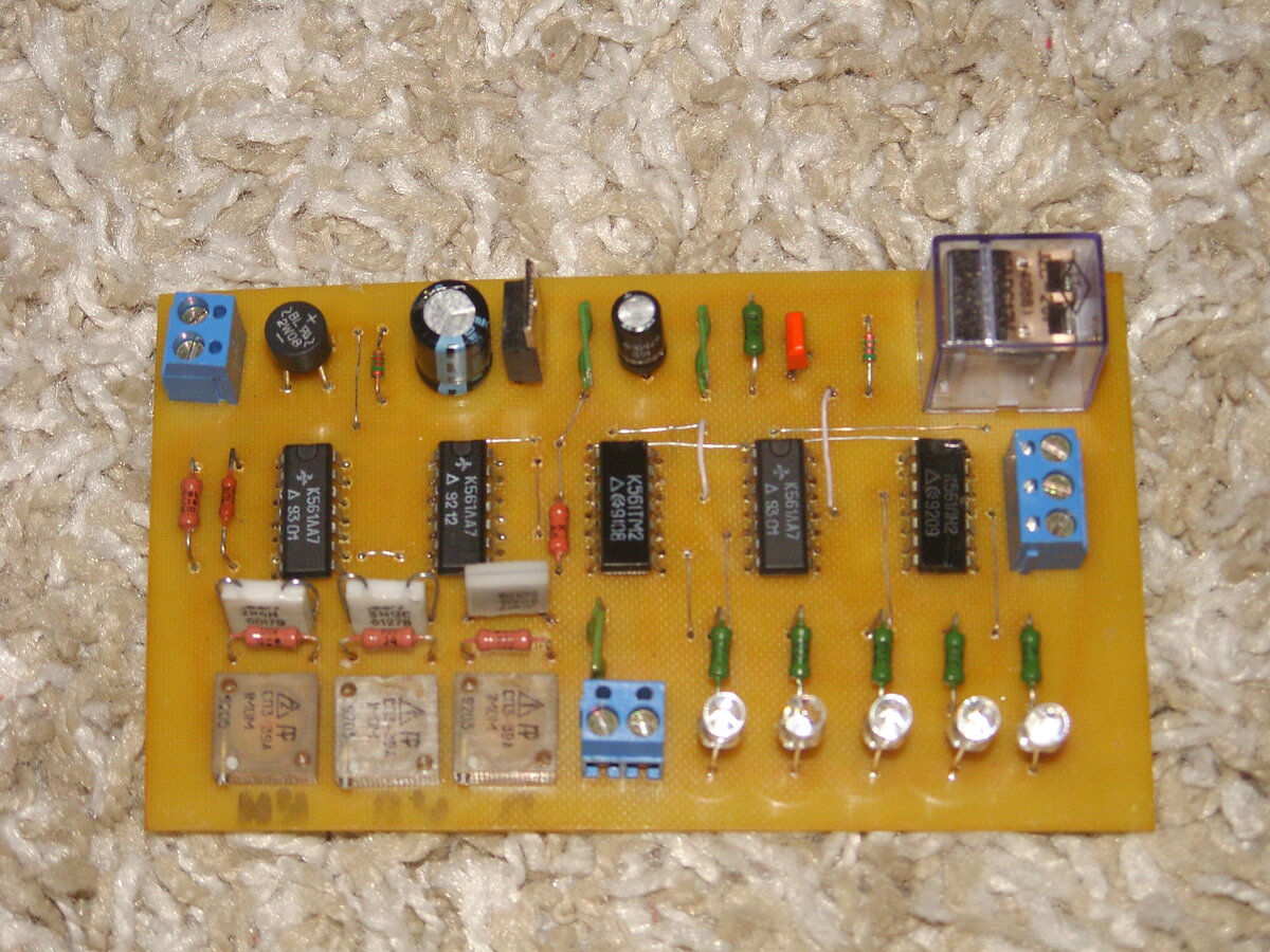 На рис.1 представлена принципиальная электрическая схема двухпозиционного регулятора уровня воды в резервуаре. Регулятор позволяет также «видеть» уровень воды в резервуаре с помощью четырех светодиодов VD5-VD8. Светодиод VD4 информирует о работе насоса. Логический элемент DD1.1 формирует положительный импульс соответствующий моменту перехода сети через нуль, который подается на один из входов логических элементов DD1.2,DD2.1,DD2.3. Инвертированный импульс с логического элемента DD1.3 поступает на три интегрирующие цепочки, которые формируют временной интервал соответствующий нижнему уровня, верхнему уровню и текущему уровню воды в резервуаре. Логические элементы DD1.2,DD2.1,DD2.3 в сочетании с интегрирующими цепочками R2,R5,C1 –(НУ) , R3,R6,C2-(ВУ), R4,R7,C3,Cд - (текущий уровень) формируют три импульса, соответствующие нижнему, верхнему и текущему уровням воды в резервуаре. Логические элементы DD1.3,DD1.4 инвертируют импульсы (НУ), (ВУ) и поступают на информационные входы D-триггеров DD3.1,DD3.2. Построечными резисторами R5-R7 устанавливаем длительности импульсов НУ, ВУ и текущего уровней (т.е. они являются задатчиками НУ, ВУ и ТУ). Выходной импульс с логического элемента DD2.3 поступает на тактовые входы обоих D-триггеров. D-триггеры DD3.1,DD3.2 выполняют функцию сравнения импульсов по длительности. Как известно сигнал с информационного входа D-триггера передается на его выход по фронту тактового импульса. Если в момент действия фронта тактового импульса (ТУ) на информационном входе будет присутствовать высокий уровень, то он будет передан на прямой выход триггера, а если низкий-то на выходе будет действовать низкий уровень. Это уровень будет сохраняться до прихода следующего тактового импульса. На логических элементах DD4.1,DD4.3 выполнен логический полусумматор, который совместно RS-триггером DD4.2,DD4.4 осуществляют двухпозиционный алгоритм регулирования. Выходной сигнал триггера с помощью транзистора VT1 включает реле К1. Контакты реле должны быть включены в цепь управление насосом. Логические элементы DD5.1-DD5.5 служат в качестве буфера питания светодиодов VD1-VD5. Желательно поставить сверхъяркие светодиоды. Светодиоды (<НУ,>ВУ), необходимо взять красного цвета, остальные зеленого. Цепочка C5,R9 устанавливают триггеры в исходное состояние при включении питания регулятора. Настройка заключается в настройке резисторов задатчиков. В начале добиваетесь свечения светодиодов (<НУ) и (<ВУ). Затем по мере наполнения резервуара регулировкой резисторов R5,R7 выставляете нижний уровень воды, таким образом, чтобы погас светодиод (<НУ) и начал светить светодиод (>НУ). При этом светодиод (<ВУ) должен светить. При достижении уровнем воды верхнего уровня регулировкой резистором R6 добиваетесь погасания светодиода (<ВУ) и свечения светодиода (>ВУ). Светодиод (НАСОС) должен погаснуть. Надо отметить, что светодиод (>ВУ) при нормальной работе регулятора светит малое время т.к. насос при достижении верхнего уровня останавливается. Но бывает так, что при ручной работе текущий уровень будет превышать установленный верхний уровень - о чем будет говорить свечение светодиода (>ВУ). При пробое изоляции датчика этот светодиод также будет светиться при любом уровне воды в резервуаре. В регуляторе использовано реле JZC-20F с катушкой в 400 Ом. Контакты реле коммутируют ток 10А. 20F с катушкой в 400 Ом. Регулятор достаточно универ