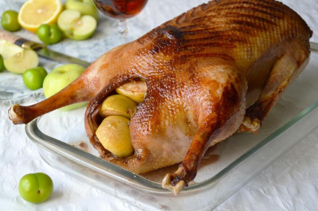 Гусь с хрустящей корочкой и начинкой из яблок и чернослива