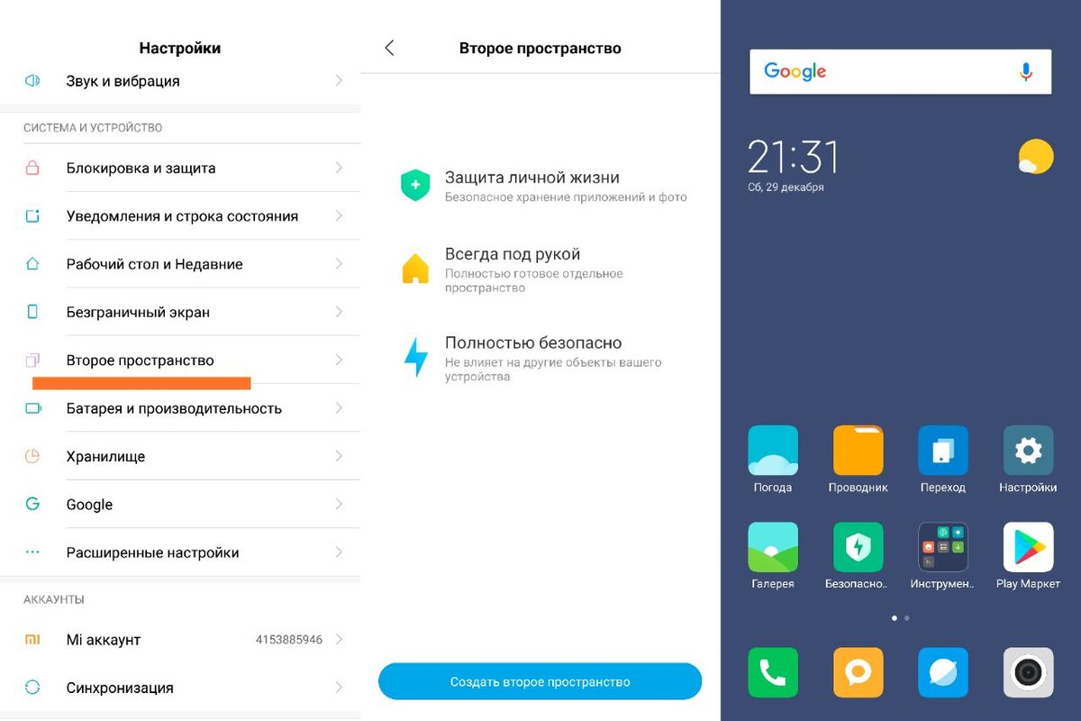 Если говорить простым языком «Второе пространство» это режим «Гость», который знаком нам по компьютеру. То есть, когда вы настраиваете «второе пространство», тем самым создаете вторую учетку на вашем смартфоне. Там будет доступ к основным программам, но не будет доступа к вашим личным данным, контактам и информации. Очень полезная настройка, не так ли? Давайте разбираться как включить на вашем устройстве «второе пространство»: 1. Заходим в настройки. 2. Переходим в раздел «система и устройство». 3. Выбираем далее раздел «второе пространство», а потом выбираем «второй пользователь». 4. Нажимаем на раздел «создать» 5. Далее проходите, весь процесс создания и устанавливаете пароль. Не забудьте настроить «второе пространство» так, как вам это будет удобно, чтобы свободно переключаться между ними. Конечно, необходимость во втором пространстве не у всех нужна, но лучше знать, как его настроить, если вдруг вам потребуется передать телефон кому-то еще. Но что же делать, когда нужно убрать вто