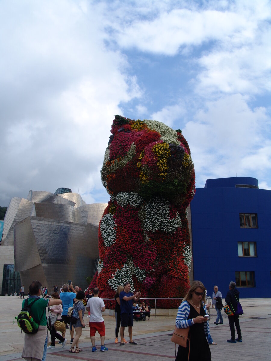 На город с манящим названием Бильбао было полдня, так что программа намечалась стандартная: набережная с музеем Гуггенхайма (без посещения), цветочный щенок и металлическая паучиха, затем старый город и пинчосы. Знаю, что для людей, даже не задумывавшихся о Стране Басков это всё абракадабра. Но поверьте, как только туда соберётесь, поймёте, что это самые попсовые места. Музей Гуггенхайма – филиал американского старшего брата, возле которого сидит гигантский щенок из цветочных однолетников, это то, что вы увидите первым делом, набрав в поисковике «Бильбао картинки». Считается, что они принесли городу известность и дополнительный поток туристов. Фиг его знает, может, так и есть. Во всяком случае, основная толпа там и тусуется. Популярность у щенка пытается оспорить недавно поставленная с другой стороны от музея металлическая паучиха, мешок с яйцами которой олицетворяет по задумке художника (это тётенька) материнство. Я дама консервативная, блондинка к тому же, современное искусство моем