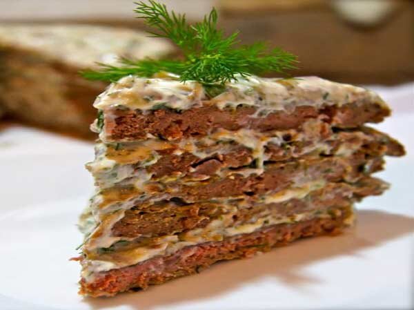 Это не десерт, а великолепная мясная закуска на праздничный стол! Блюдо очень вкусное, готовиться быстро, да и печень вы можете взять любую на ваш вкус. Обязательно попробуйте приготовить, надеюсь, такая закуска вам понравится, и вы поделитесь этим рецептом со своими друзьями. Что потребуется, для приготовления печёночного торта смотрите ниже… Необходимые ингредиенты для блюда (на 5-7 порций): · 0,6 кг печёнки (любой); · 250 гр. манной крупы; · 0,5 л молока; · Пара ст. ложек масла растительного; · 4 свежих яйца; · Три дольки чеснока; · 400 мл майонеза. Способ приготовления закуски: 1. Для начала печень нарезаем на куски, удаляем прожилки (при необходимости) и измельчаем. Для этого можно использовать мясорубку или блендер. Последний раз я делал это именно блендером, получилось всё замечательно. 2. Далее печёночную массу перчим, солим, добавляем манку и перемешиваем до однородности. 3. После этого в печеночную массу добавляем сырые яйца и взбиваем. 4. Затем добавляем молоко и масло, е