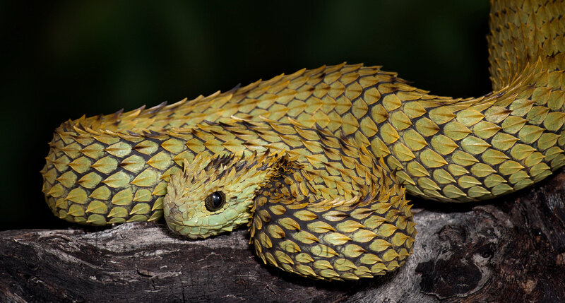 Чешуя у древесной гадюки не сильно задрана вверх, у нее не такие большие размеры. Считается, что этот вид змеи и колючая кустарниковая змея имеют одних предков.