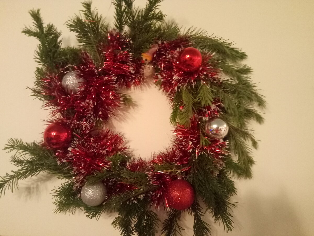 Сегодня сделала Новогодний венок для украшения квартиры! Мне понравилось то что получилось)))) Для его создания взяла проволоку у мужа, сделала из нее круг. понадобились еше мишура, еловые ветки и елочные украшения. На проволоку сначала скотчем примотала веточки Потом закрепила эту конструкцию, примотав достаточно плотно мишуру (прошла ею два раза по кругу). Ну, и настал момент декора - у меня шарики и снеговичок. Можно было бы еще шишки добавить, но у меня их не оказалось... С наступающим вас Новым Годом! Счастья, здоровья, красоты, любви!
