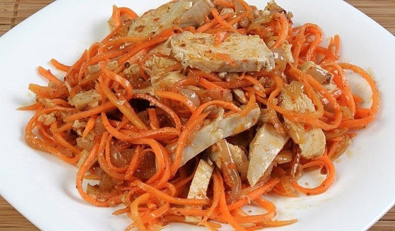 Тарги-хе это хе из курицы. Очень быстро, очень просто, если есть в холодильнике немного морковчи- то еще вкуснее и красивее! Ну что, все готовы? Это проще простого. Нам понадобится: куриные окорочка примерно 1, 5 кг, чеснок, лук репчатый, растительное масло, уксусная кислота, перец красный и перец черный молотый, паприка молотая, соль, кориандр молотый, кунжутное масло. глутамат натрия 1) Куриные окорочка разморозить, снять шкурку, жир. Положить в КИПЯЩУЮ ВОДУ (так мясо вкуснее) и варить до готовности. (Бульон нам не нужен, супчик потом можно сварить.) 2) Вынуть окорочка из кастрюли и остудить. Мясо с них оторвать руками или помощью ножа и нарезать. Можно кубиками, можно полосками. Переложить в БОЛЬШУЮ миску для последующего перемешивания. 3) Чеснок 1-2 головки (НЕ КИТАЙСКИЙ- посинеет, потом салат будет некрасивый!) отечественный очистить, зубки пропустить через чесноколдавилку, массы чесночной должно быть 2 столовые ложки примерно. Разделить чеснок на две части. 4) Большую л