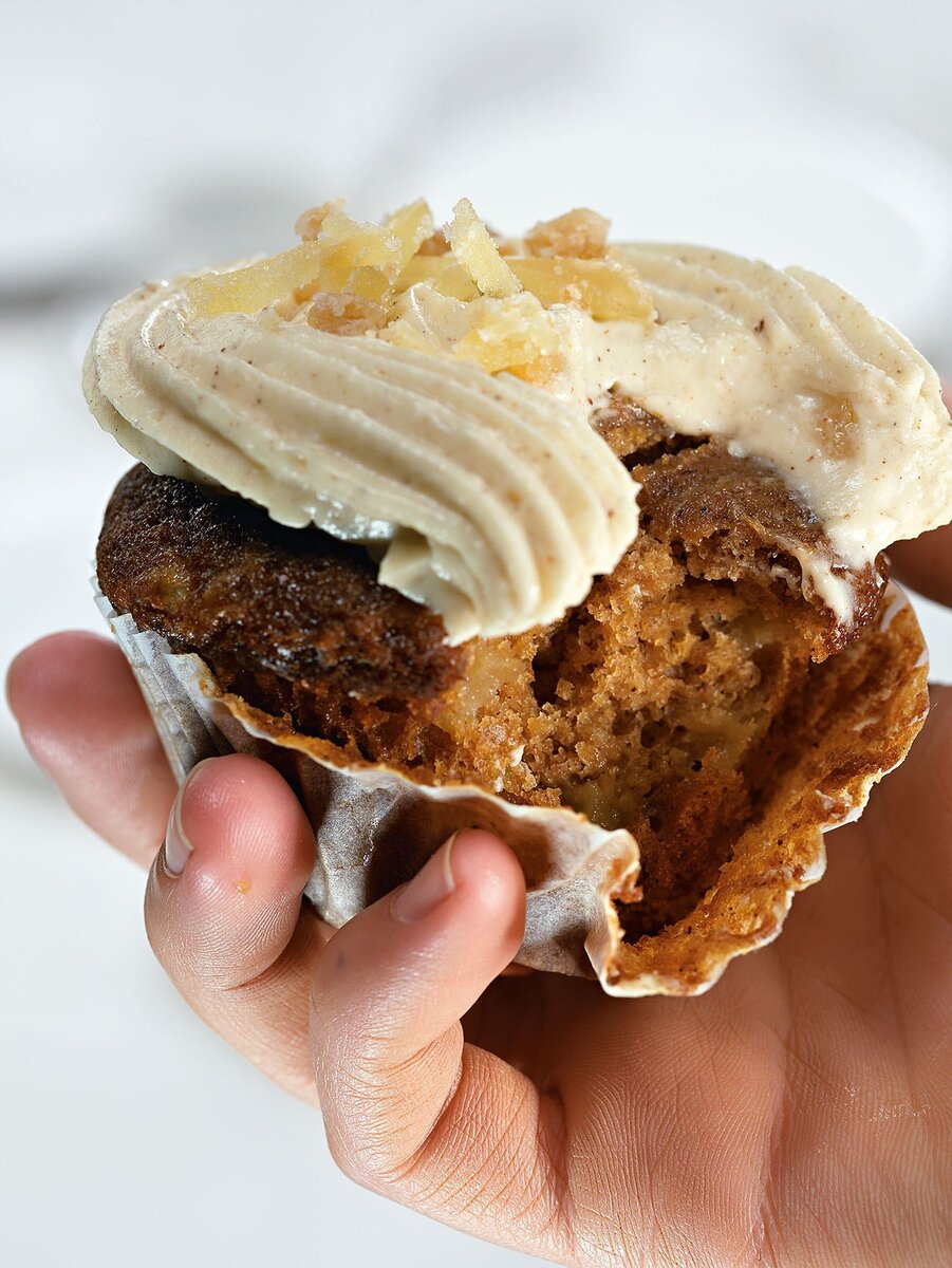 Пшеничная мука 180 г Разрыхлитель 1 чайная ложка Корица 1 чайная ложка Сода 1 чайная ложка Сахар мусковадо 200 г Яйцо куриное 2 штуки Китайские пряности «Пять специй»¼ чайной ложки Яблочное пюре 130 г Кальвадос 1 столовая ложка Яблоко 1 штука Кефир 120 мл Лимонная цедра 1 штука Сыр филадельфия 225 г Ванильный экстракт 1 чайная ложка Сахарная пудра 115 г Сливочное масло 80 г Молотая корица ¾ чайной ложки 1. В миске смешать муку, разрыхлитель, соду, соль и специи. 2. В растопленном в сотейнике 80 граммах масла растворить сахар мусковадо. Снять с огня и слегка остудить. 3. Вмешать в теплую смесь яйца. Добавить яблочное пюре, кефир, цедру, кальвадос и экстракт ванили. 4. Вмешать мучную смесь. 5. Нарезать яблоко на маленькие кубики и вмешать их в тесто. 6. Разложить тесто в формочки и выпекать при 175°С примерно 18 минут. Остудить. 7. Поместить «филадельфию», сахарную пудру и молотую корицу в миску и вооружиться миксером. Сначала на небольшой скорости добиться