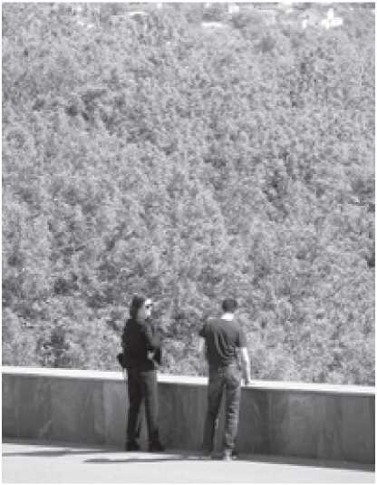 В неспешной беседе наши эксперты прошли улицу Ленина, пересекли Вали-ди и вышли, наконец, к цели своей прогулки — обширной заасфальтированной стоянке перед парапетом у Дома Правительства. День был воскресный, и почти все пространство стоянки было свободно от автомобилей. По нему прогуливались уфимцы: влюбленные пары ворковали у парапета, отцы семейства приобщали своих несмышленышей к опыту покорения просторов. А кто-то просто блуждал взглядом по открывающемуся с парапета панорамному виду на уфимские окрестности.