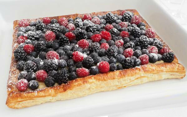 Пирог из готового слоёного теста, с заварным кремом и ягодами. Готовить просто, ягоды по вкусу, свежие или размороженные. При приготовлении крема, вместо сахара можно положить заменитель, чтобы уменьшить количество углеводов. РУКОВОДСТВО ПО ПОДГОТОВКЕ ⦁ время приготовления – 3-3,5 часа; ⦁ количество порций - 10 шт.; ⦁ калорийность – 185 ккал на 100гр. ИНГРЕДИЕНТЫ ⦁ 1 большой лист слоёного теста (400 гр.); ⦁ 500 гр. ягод свежих или мороженных; ⦁ 500 мл. молока; ⦁ 1 стручок ⦁ ванили; ⦁ 120 гр. сахара или эквивалентно сахарозаменителя; ⦁ 4 яичных желтка; ⦁ 40 гр. кукурузного крахмала; ⦁ сахарная пудра для украшения. ПРИГОТОВЛЕНИЕ Готовим заварной крем. Налить в кастрюлю молоко, поставить на огонь, положить разрезанный по вдоль стручка ванили с извлечёнными семенами. Довести молоко до первых признаков кипения, накрыть крышкой и снять с огня. В другую кастрюлю положить желтки, сахар, кукурузный крахмал, и перемешать до однородной массы. Процедить молоко, что