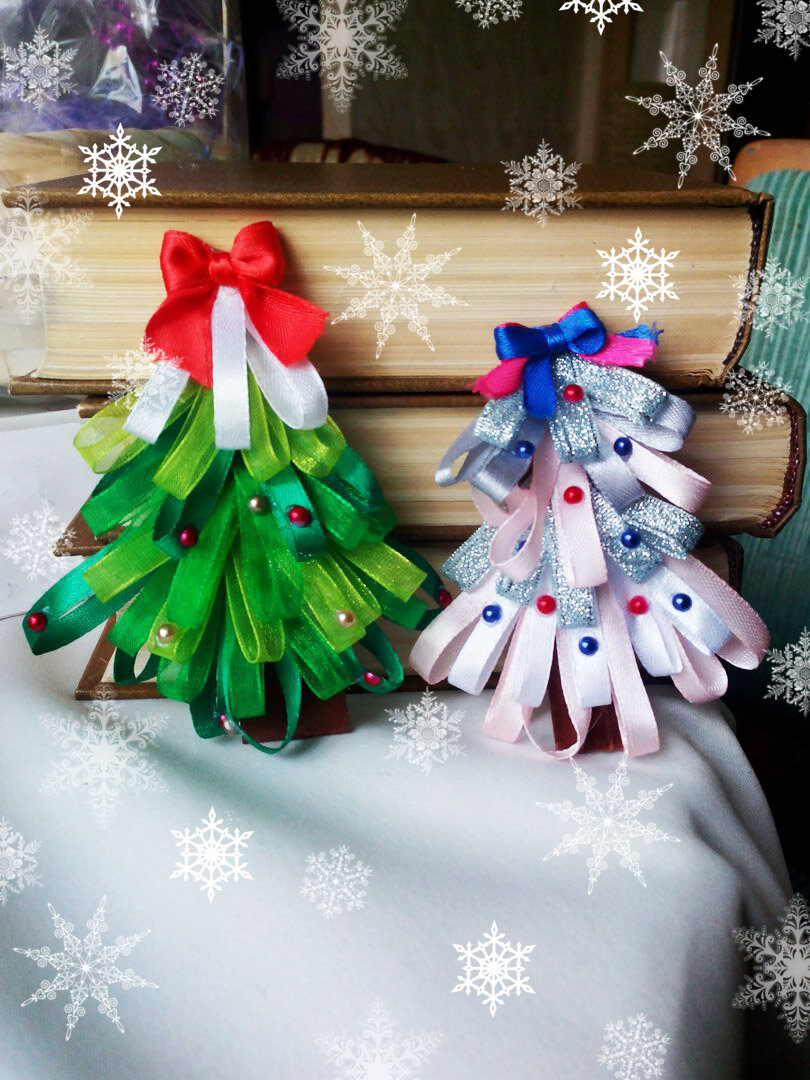 Вам потребуется: 1) магнитная основа (можно купить пару плоских магнитов или снять надоевшие с холодильника, нарезать на небольшие полоски - это будет ствол нашей будущей ёлочки) 2) ленты (коричневая, пошире, для ствола, и всякие разные ленты шириной 0,5 см для ёлочных веток) 3) клеевой пистолет (или суперклей) 4) полубусины, стразы, пайетки для украшения Подробный мастер-класс можно найти на просторах интернета. Если вкратце, то вам нужно будет сделать заготовки-лепестки разной длины из ленточек и научиться завязывать бантик на вилке. Я это делала заранее, чтобы мы с учениками успели и поучиться, и ёлочку смастерить. Обязательно проведите инструктаж по технике безопасности! Клеевой пистолет в процессе сильно нагревается, ребенок может обжечься, если возьмется за него неправильно. Суперклей тоже не самая безопасная субстанция. У нас, к счастью, обошлось без неприятностей:) Итак: 1) наклеиваем коричневую ленту на магнит, делаем ствол ёлочки 2) наклеиваем первый, нижний ряд лепестков-ве