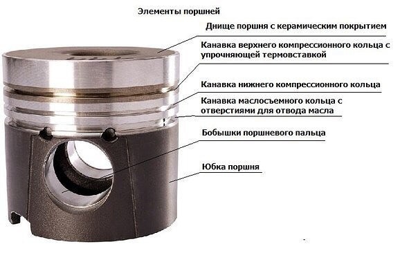 Поршень представляет собой сложенные воедино днище, головку и юбку, которые выполняют совершенно разные функции. Днище поршня плоской, вогнутой или выпуклой формы содержит в себе камеру сгорания. Головка имеет нарезанные канавки, где размещаются поршневые кольца (компрессионные и маслосъемные). Компрессионные кольца исключают прорыв газов в картер двигателя, а поршневые маслосъемные кольца способствуют удалению излишков масла на внутренних