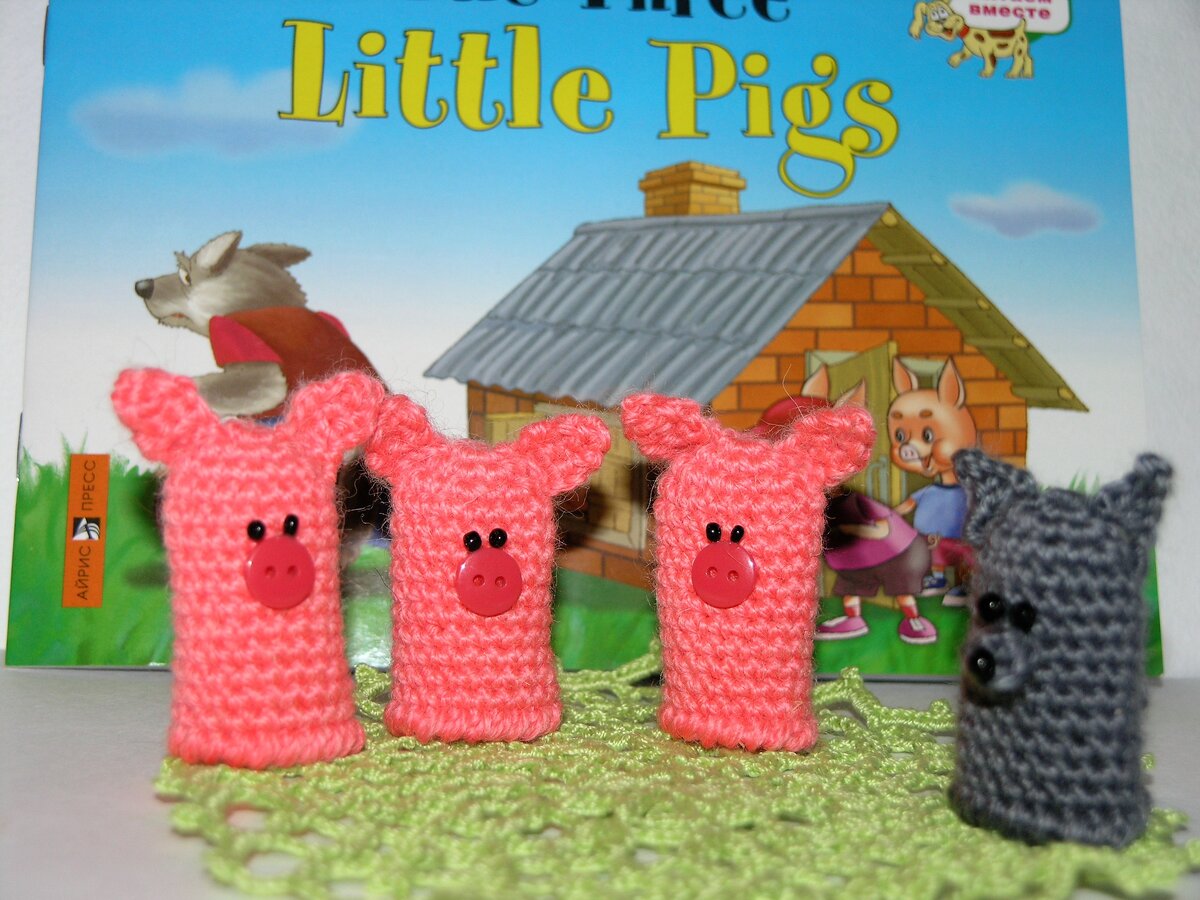 В театр можно играть вдвоём, если это пальчиковый театр. Сколько пальчиков, столько и актеров. Даже одна игрушка поможет выразительно рассказать сказку, решить проблему, успокоить и развеселить малыша. Игра в театр полезна для развития речи, внимания, мышления, воображения. Как любой творческий процесс театр интересен детям, особенно когда они становятся его непосредственными участниками. Оживить куклу – захватывающее дело, требующее фантазии и смекалки. Когда дети были маленькими, я вязала пальчиковых кукол по мастер-классам Дарьи Никулиной. Игрушки получались красивыми и забавными. Иногда девочки играли ими самостоятельно, придумывая истории. Где те игрушки, уже и не вспомню. Какие-то отдала в детский сад, некоторые стали подарками знакомым малышам. Сейчас читаем книжки на английском языке с 6-летней дочкой. Чтобы закрепить и запомнить фразы и слова, авторы советуют играть в театр. Идея это не даёт покоя несколько недель, поэтому решила связать героев «Трёх поросят». Тем более,