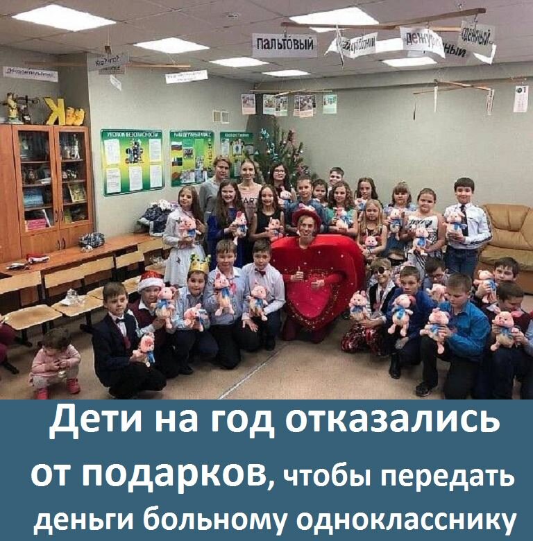 ДОБРАЯ НОВОГОДНЯЯ ИСТОРИЯ ИЗ ГОРОДА СТАРЫЙ ОСКОЛ Ученики четвертого класса одной из школ в Старом Осколе Белгородской области отказались от подарков на Новый год. В российских школах часто собирают деньги на празднование Нового года в классе. Обычно это чае- и сококопитие со всякими сладостями. Но старооскольские четвероклашки решили отдать эти деньги однокласснику, которому требовалась сложная операция Как рассказала ТАСС классный руководитель Галина Толстых, «никакого героического поступка не сделали — просто отказались от подарков к Новому году, которые обычно готовят родители». В СМИ пишут, что четвероклассники организовали благотворительную ярмарку, чтобы собрать средства на лечение друга. Им помогали родители. А некоторые ребята отказались от подарков на Новый год, День защитника Отечества и 8 Марта. Один мальчик даже принес довольно большую сумму, которую родители копили ему на велосипед. На фотографии тот самый класс. Издание Oskol City рассказало о трогательной детали: д