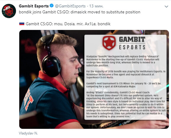 Официальный твиттер Gambit объявил о изменениях в ростере CS:GO состава Владислав «bondik» Нечипорчук заменит Дмитрия «dimasick» Матвиенко в основном составе Gambit CS:GO. Bondik взят под двухмесячный пробный период, Дмитрий перемещен на замену. В основном весь 2018 год bondik провёл играя за HellRaisers. В ноябре этого года он стал свободным агентом и заменил dimasick на SuperNova CS:GO Malta. Андрей «Blad3» Городенский, Тренер Gambit CS:GO: "На данный момент Дима не полностью подходит под нашу систему. Он ощущает дискомфорт и сложность с нами, из-за того что его стиль построен на индивидуальной игре. Мы любим Диму за его способности, но в данный момент не можем включить его в свою систему. К сожалению, мы не имеем возможности ждать его трансформации, в то время как он будет находиться в нестабильном состоянии. Дима имеет потенциал в команде которая хочет играть с ним." Следующий турнир Gambit, это CIS Миноры на Мажор. Борьба за слот на IEM Katowice Major начнётся 16 января и буде