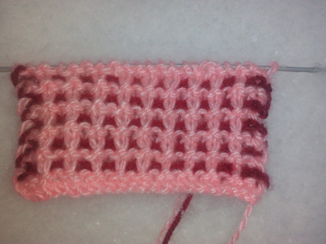 Число петель кратное двум плюс одна, плюс кромочные. 1, 2, 5 и 6-й ряды (светлая нить): лицевые петли. 3-й ряд (темная нить): * 1 лицевая, 1 снять лицевой (нить сзади)*, 1 лицевая. 4-й ряд (темная нить): * 1 лицевая, 1 снять изнаночной (нить впереди)*, 1 лицевая. Повторять с первого ряда.